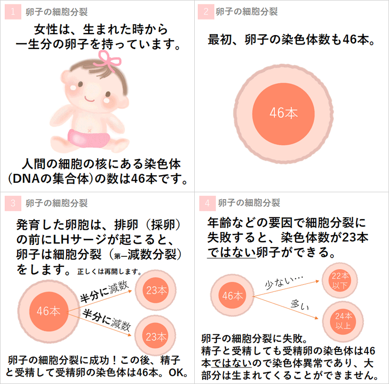 40代はタイミング法や人工授精はもちろん、体外受精であっても卵子の老化による、減数分裂の失敗から生じる染色体異常により妊娠は難しくなります。