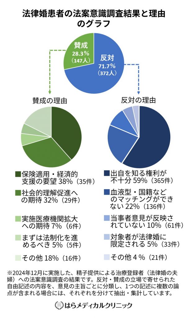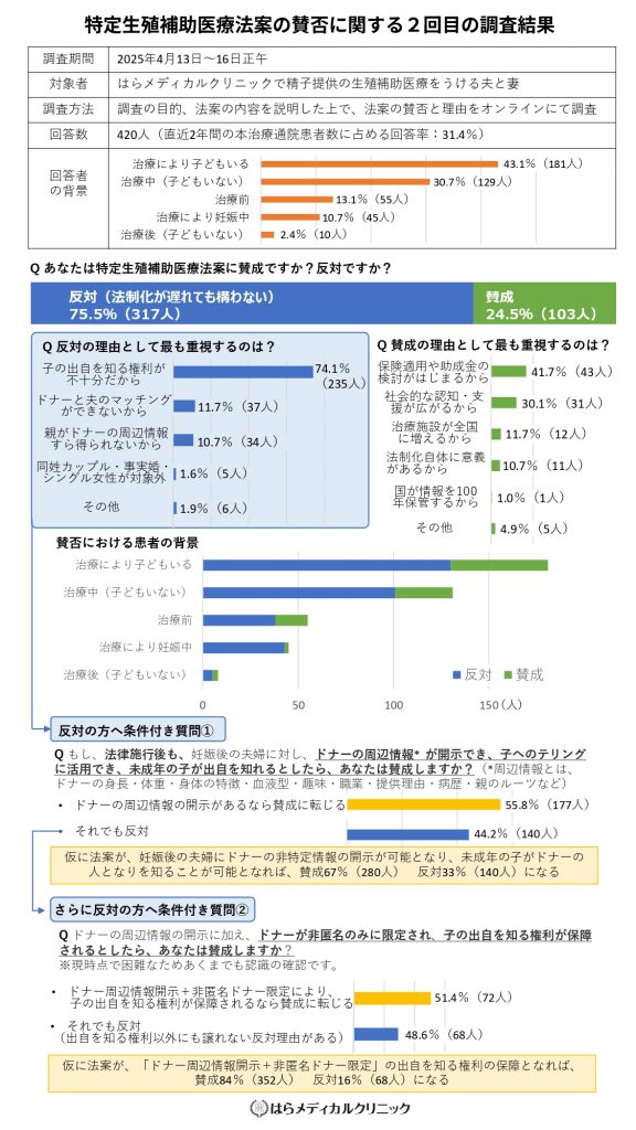 当院が実施したアンケート調査では、精子提供による生殖補助医療を受けている法律婚の夫婦のうち、75.5%が特定生殖補助医療法案に「反対(法制化が遅れても構わない)」と回答しました。反対の理由として最も多かったのは、「子の出自を知る権利が不十分だから」で、全体の74.1%を占めました。