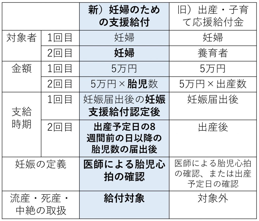 「妊婦のための支援給付」は、2022年度補正予算で始まった「出産・子育て応援交付金事業」を引き継ぎ、2024年6月に成立した法律(令和6年法律第47号)により法定化された国の制度です。