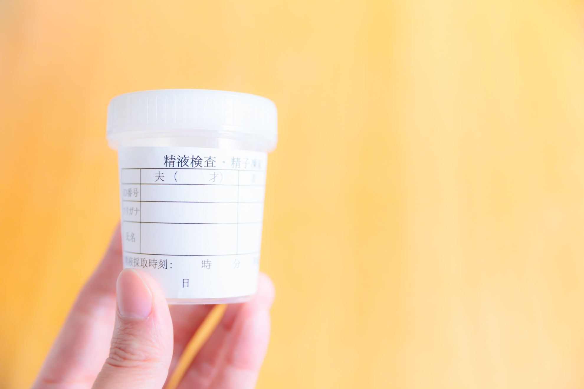4. 精液を専用容器に採取する診察予定時間の3時間以内または院内で精子を採取します。精子はマスターベーションにより採取してください。オイルやコンドームの使用、マスターベーション以外の方法での採取は行なわないようにしましょう。精子は射精した全量を容器に入れて提出します。提出までは常温で保管してください。冷蔵すると精子が死滅するため、冷蔵は厳禁です。