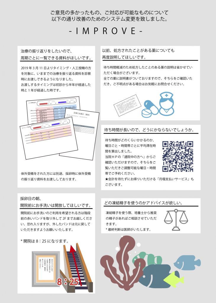 患者さまの声 2018患者さまの声 貴重なご意見ありがとうございました。 画像をクリックすると大きな画像を確認して頂けます。 妊娠体験記!やって良かったこと。悪かったこと。[2020年12月ご卒業分] 2017年全患者様アンケートの結果と改善対応について TOP ブログ・体外受精説明会レポート 患者さまの声 2018患者さまの声
