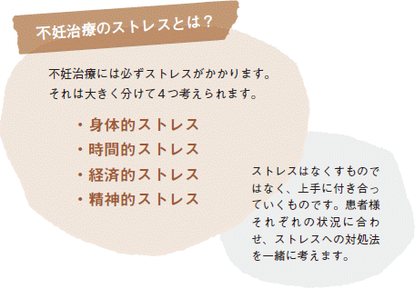 不妊治療をしていると、「辛い」と感じながらも日常生活と治療の両立で精一杯で、ご自身にとって大事な「心のケア」にまで、なかなか考えが及ばないかもしれません。不妊治療は”治療”ではあるものの、痛みや疾患を治すというものではなく、「子どもが欲しい」という”思い”、つまり心が基本となる特殊な医療です。だからこそ、なおざりにしてしまいがちな「心」をケアすることを大事に考えていただきたいと思います。