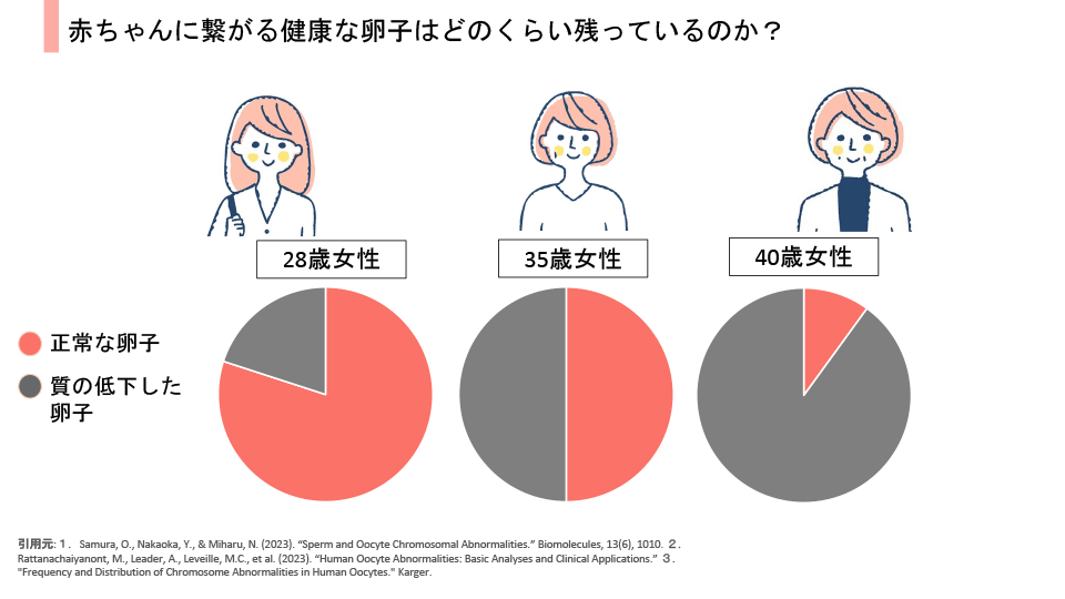 そのため、卵子の老化を遅らせたり止めたりする治療法や食事はなく、妊娠する力が高い時期に採取した卵子を保存することが現実的な手段です。