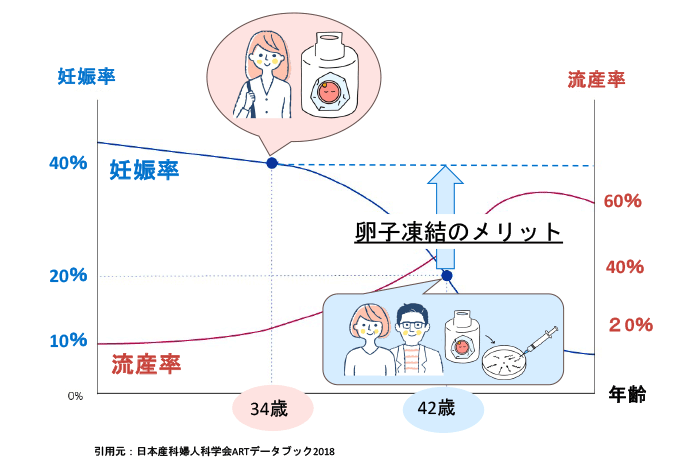 若い時期に凍結した卵子は妊娠の確率が高いです。例えば、下のイラストにあるように、34歳で卵子を凍結保存し、42歳で使用する場合、妊娠を左右する卵子の質は34歳時点のものであるため、その分高い妊娠率が期待できます。