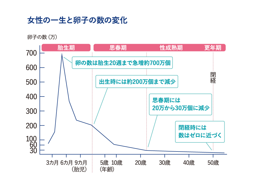 女性は生まれたとき、卵子を約200万個有していますが、思春期頃にはその数が約30万個にまで減少します。その後も卵子は減り続け、増えることがありません。ある一定の基準以下に卵子の在庫数が減少すると、妊娠しづらくなり、さらに減少が進むと閉経します。