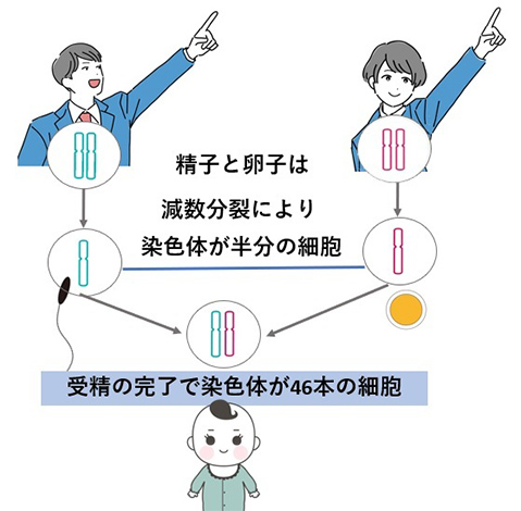 人間の細胞には46本の染色体(DNAの集合体)があります。精子と卵子の元の細胞の染色体も染色体が46本です。その細胞が「減数分裂」をして染色体が半分(23本)の精子と卵子になります。そして、染色体が半分ずつの精子と卵子が受精を完了することで、受精卵の染色体は46本になり、赤ちゃんとして生まれてきます。