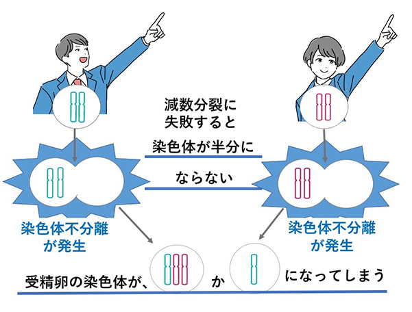 しかし、減数分裂に失敗すると、染色体の不分離が発生し、精子と卵子は半分になりきれなかった染色体数(23本ではない)になります。その精子と卵子が受精をしても受精卵の染色体は正常(46本)ではないため、妊娠しなかったり、流産するという原因になります。
