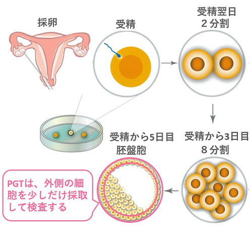 体外受精における採卵で採れた卵子を受精させ、5日間培養し、胚盤胞(はいばんほう)と呼ばれる状態まで発育したら、胚盤胞の細胞を少しだけ採取して検査機関に提出します。検査は日本産科婦人科学会から承認を得ている専門の検査会社が行います。