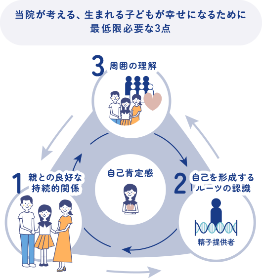 生まれる子どもが幸せになるために最低限必要なことは「自己肯定感」をもてるような仕組みを整えることです。当院は、子どもたちが自己肯定感をもつために、1.親との良好な持続的関係があり、2.自己を形成するルーツの認識があり、3.周囲の理解が必要と考えており、そのような仕組みを整えています。